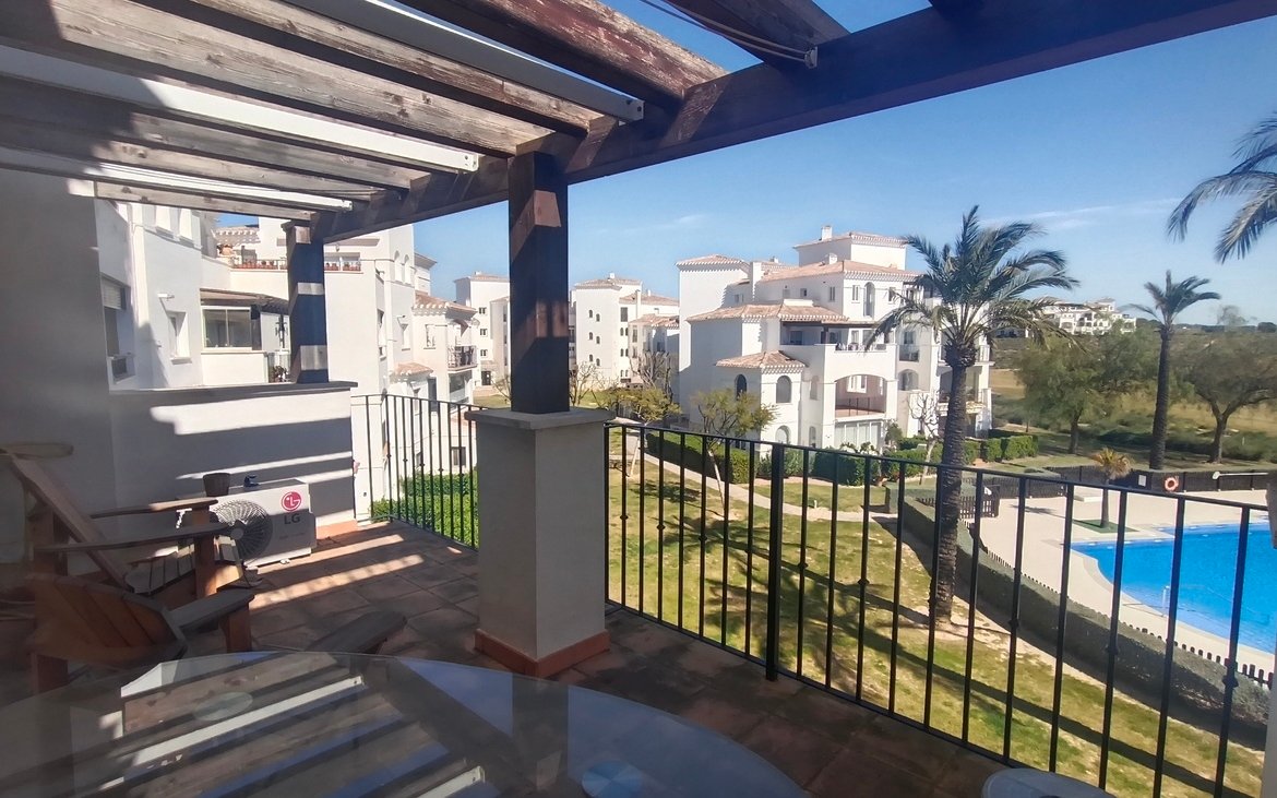 This light, bright and exceptionally spacious apartment on Calle Adriático truly has it all — spectacular golf and lake views, dual terraces, lift access, underground parking, and an enviable position close to resort amenities.The apartment opens into a generous living–dining area featuring an attractive curved wall design that creates a defined dining space. The room is furnished with a glass dining table and chairs, comfortable sofa, auxiliary seating, and storage units, offering a welcoming and practical layout.Large patio doors lead directly onto the spacious east-facing terrace, where you can enjoy spectacular open views across the swimming pool, golf course and lake. Perfect for morning coffee and sunrise views, this terrace benefits from one of the resort’s most sought-after orientations while remaining conveniently close to the bar and amenities.To the left of the entrance hallway is the impressively large, square kitchen — fully fitted with ample cabinetry and complete with fridge-freezer, washing machine, dishwasher, ceramic hob, oven and extractor fan. A kitchen window frames beautiful golf course views, making it both bright and enjoyable to work in.The curved wall in the living room leads through to an inner hallway giving access to the sleeping accommodation.On the left is a spacious family bathroom, fitted with shower, WC and vanity unit.There are two bedrooms:Master bedroom with double bed, fitted wardrobes, bedside cabinets and air conditioningSecond bedroom currently arranged with a single sofa bed and air conditioningBoth bedrooms benefit from patio doors opening onto a second west-facing terrace, enjoying mountain views and evening sunshine — ideal for relaxing at the end of the day. With doors open to both east and west terraces, the apartment benefits from excellent natural airflow and a wonderful cross-breeze.The property is sold fully furnished as seen and is located in a prestigious building with lift access. An underground parking space is included in the sale.Set within the beautiful Hacienda Riquelme Golf Resort, residents enjoy:19 communal swimming poolsLandscaped gardens24-hour securityGolf course and driving rangeSports facilitiesOn-site supermarket and restaurantThe charming village of Sucina is just a short drive away, with the coast and airport approximately 20 minutes by car.This is an ideal lock-up-and-leave holiday home, yet spacious enough for comfortable permanent living. Early viewing is highly recommended.