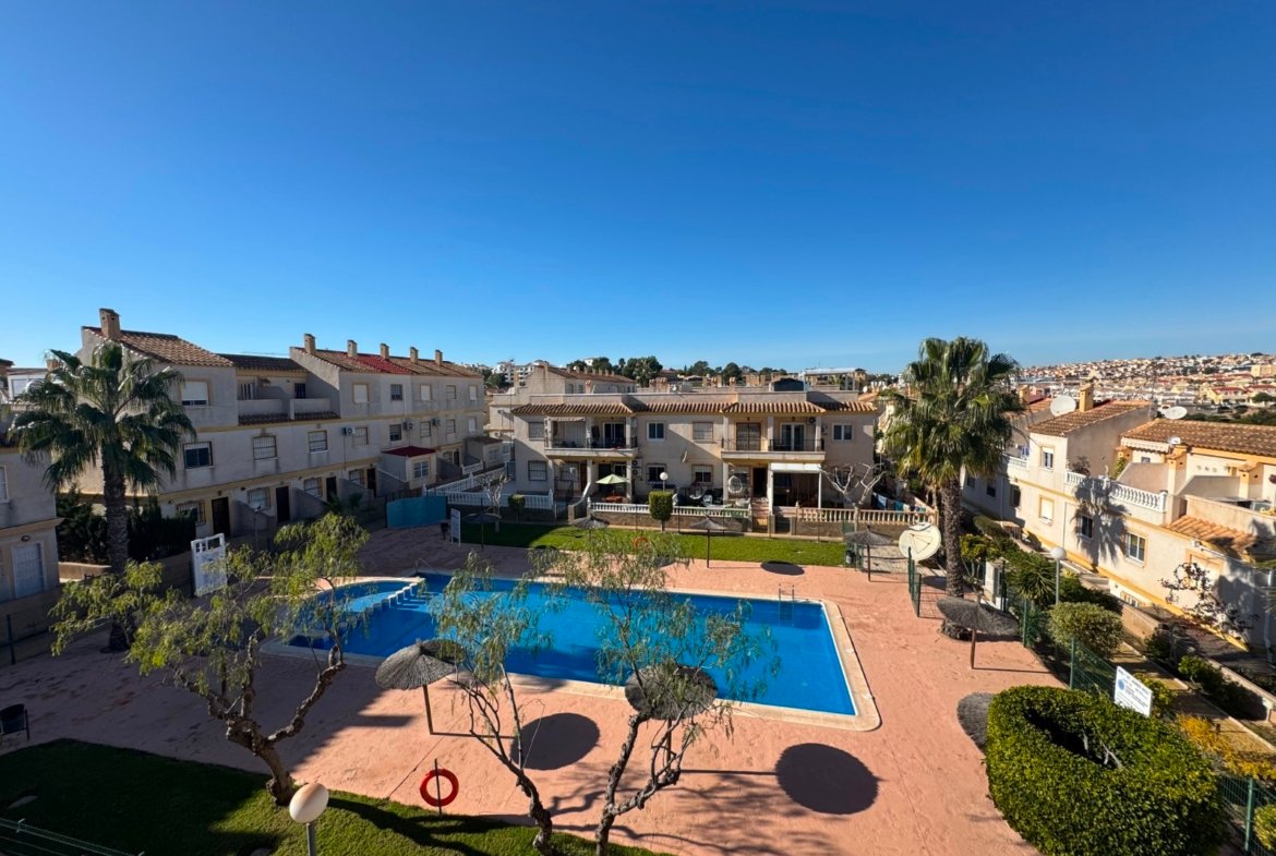 Do not miss this opportunity to acquire a wonderful first-floor apartment in the highly sought-after area of St James Hill. Ideally positioned within a secure community accessed via communal electric gates, this beautifully presented two-bedroom, one-bathroom property offers both comfort and convenience in a prime location.Upon entering the apartment, you are welcomed into a bright and spacious open-plan living area, seamlessly connected to a fully fitted modern kitchen with integrated utilities. Large windows and patio doors flood the space with natural light and lead directly onto a private terrace overlooking the communal swimming pool, creating a bright and airy atmosphere ideal for relaxation and entertaining.The property benefits from hot and cold air conditioning throughout and is south-facing, ensuring year-round comfort and excellent sunlight. The apartment is fully furnished with high-quality furniture, fixtures, and fittings, complemented by elegant white porcelain flooring throughout.The smaller bedroom is generously sized and currently accommodates a king-size bed, while also being well-suited to a standard double. It features a large window allowing ample natural light. The stylish bathroom includes a walk-in shower and a modern vanity unit. The larger bedroom includes fitted wardrobes is also south-facing, and offers views over the communal pool area, and .A standout feature of this property is the private rooftop solarium, fully equipped with a bar and sunbathing area—perfect for enjoying beautiful Mediterranean summer evenings.Additional benefits include a designated private parking space. This apartment is ideal as a permanent residence, a holiday home, or a lock-up-and-leave investment with excellent rental potential.The location is exceptional, with La Fuente Commercial Centre within walking distance, offering a wide range of bars, restaurants, pharmacies, and supermarkets. Three renowned golf courses are also located nearby.A truly beautiful apartment that must be seen to be fully appreciated.