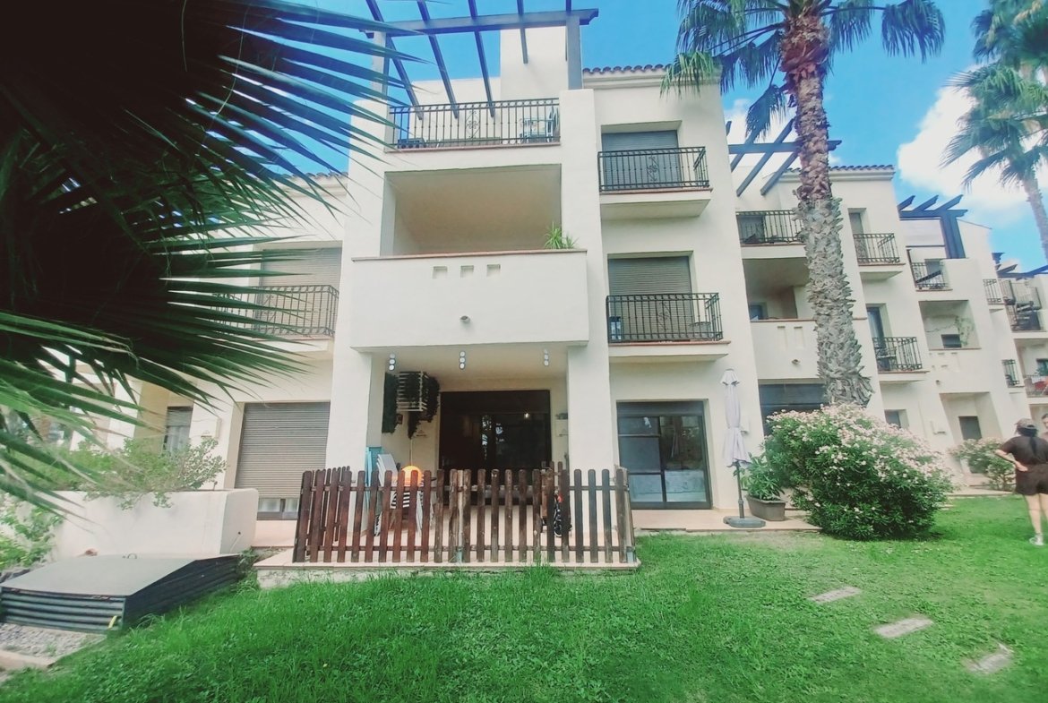 This beautiful ground floor garden apartment offers luxuary spacious living overlooking gardens with pool nearby in Roda Golf Resort. The apartment enters into a beautiful living and dining room with features including marble flooring, high quality L shaped sofa, storage units, dining table and chairs and air conditioning with patio doors overlooking the terrace and gardens. The terrace is east facing for morning sun and south facing to the side; it is mainly covered and it is spacious; it is tiled throughout with natural terracotta tiles and surrounded by wooden fence. The ideal space for enjoying sunshine and eating outdoors. The kitchen comes with fitted kitchen, hob, oven fridge freezer and washing machine. There is a hallway off the living room leading to 2 double bedrooms; the first bedroom to the front of the apartment comes with double bed, bedside cabinets fitted wardrobes and patio doors overlooking a bedroom terrace with direct access outside. It has an en suite bathroom with vanity unit, wc and bath tub with shower. The second bedroom at the rear of the apartment comes with a built in dressing room, a double bed and headboard with bedside cabinets and window. The main bathroom is between the bedrooms currently with a wc and vanity unit. This apartment is situated near the main security gate for easy access, it comes with underground parking, 24 hour security, communal gardens and pools and many other facilities. The resort offers a great golf course and restaurant. Just a short walk to Roda village and close to Los Alcazarez with many supermarkets, restaurants and great beaches. This apartment is in very good condition, it will be sold fully furnished and is highly recommended for viewing.