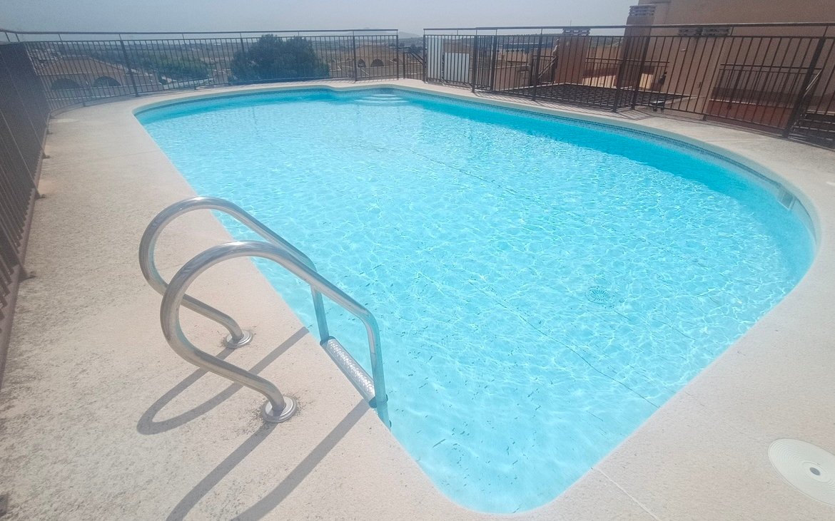 This light, bright, and airy apartment in Sucina offers spacious and comfortable living in a well-maintained, centrally located building with lifts and a rooftop swimming pool.Upon entering, you are welcomed by a wide entrance hallway, ideal as a reception area, which leads into a central corridor connecting the rest of the home.To the right, you’ll find the main bathroom, complete with a bathtub and shower, WC, and sink.To the left, the living room is a standout feature—generously sized with floor-to-ceiling windows on both sides, allowing natural light to flood the space throughout the day. With its southwest orientation, the room enjoys sunshine from morning through evening. The windows are fitted with railings, creating a pleasant spot to sit, relax, and soak up the light.Further along the corridor on the left is the fully fitted kitchen, offering ample space, worktops, and included appliances—ideal for both everyday living and entertaining.Next is a spacious double bedroom with built-in wardrobes, providing practical storage and comfort.At the end of the corridor is the master bedroom, a bright and airy space featuring floor-to-ceiling windows on both sides, allowing for excellent natural ventilation and light. It comfortably accommodates a double bed and creates a peaceful retreat.The building itself is clean, well cared for, it comes with fully integrated air conditioning and ideally located close to all local amenities. With both lift and stair access, as well as a rooftop swimming pool, it offers convenience and lifestyle in equal measure.