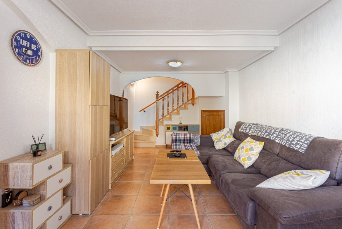 This 86 m² townhouse for sale is located in El Mojón, one of the most peaceful coastal areas of Pilar de la Horadada, just 300 metres from the sea, close to beaches, the promenade and parks, and surrounded by all essential services such as supermarkets, restaurants and sports areas.The house is divided into two floors:Ground floor: spacious 22 m² living-dining room, perfect for family gatherings; independent kitchen fully equipped; one bedroom on this level with easy access; full bathroom; and a storage room ideal for bikes, beach gear or tools. There is also a front terrace to enjoy the outdoors.First floor: features two bright bedrooms, both with built-in wardrobes, a full bathroom and a private terrace.On the rooftop there is a private solarium, ideal for sunbathing, relaxing or enjoying the sea breeze.Its excellent location makes it perfect as a permanent residence or a holiday home in the South Costa Blanca, with the beach, promenade and green areas just a short walk away.